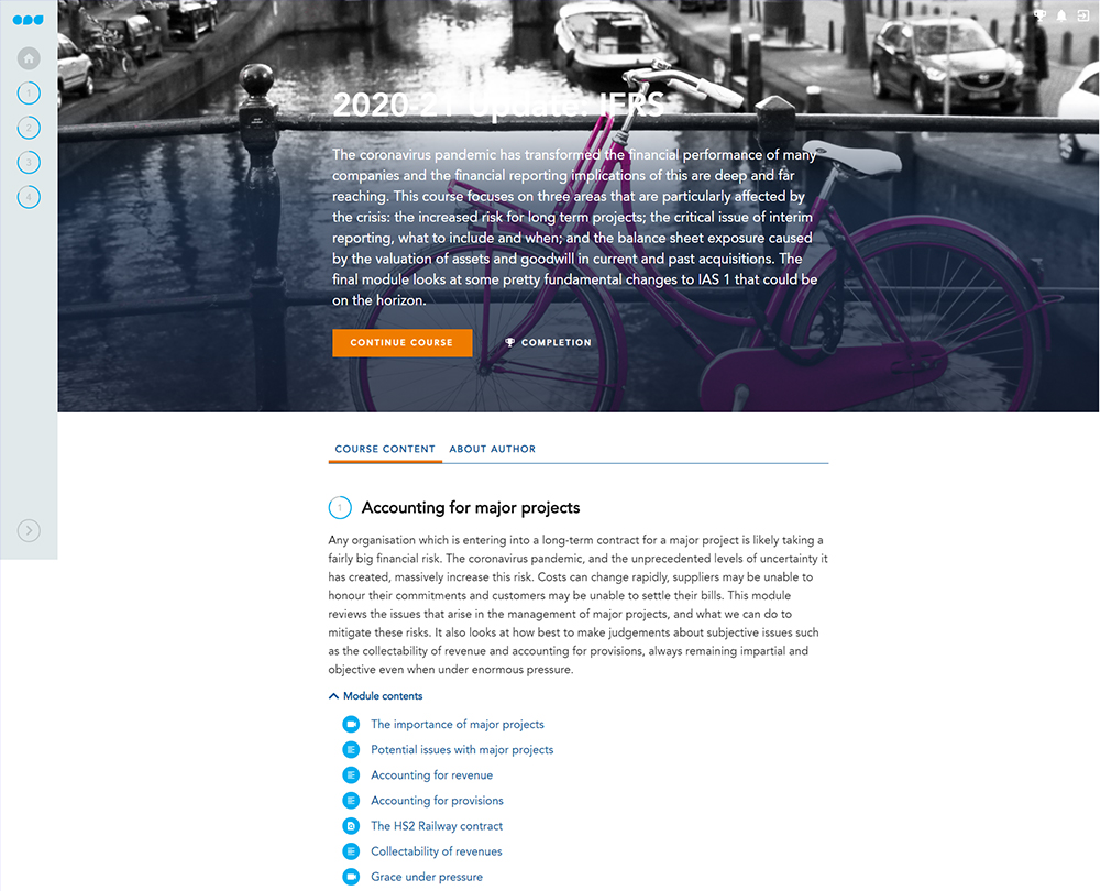The coronavirus pandemic has transformed the financial performance of many companies and the financial reporting implications of this are deep and far reaching. This year's IFRS updates course focuses on three areas that are particularly affected by the crisis: the increased risk the pandemic has created for long term projects; the critical issue of interim reporting, what to include and when; and the balance sheet exposure caused by the valuation of assets and goodwill in current and past acquisitions.